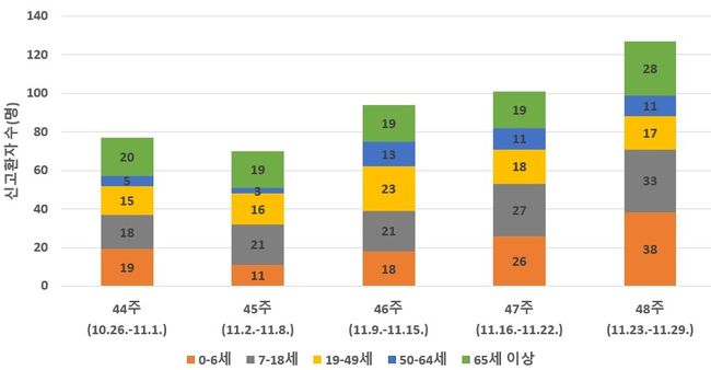 최근 집계에서 환자 수는 47주 101명에서 48주 127명으로 증가했고, 지난해 같은 기간(2024년 48주) 대비 58.8% 늘어난 것으로 나타났다. 전체 환자 중 0~6세 영유아 비중도 29.9%에 달해 겨울철 집단생활 시설을 중심으로 확산 위험이 커진 상황이다.